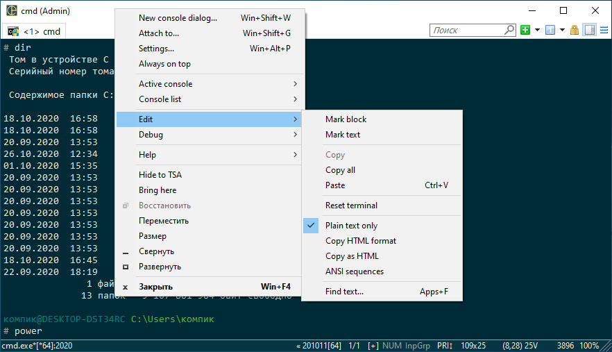 - Полноэкранный режим, копирование и вставка текста из консольной области.