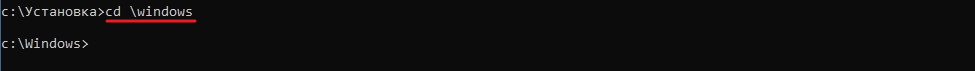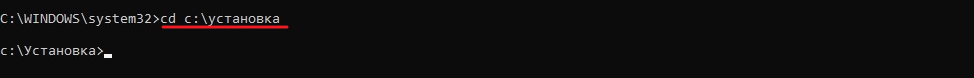 Для возврата в папку «Установка» или перехода в любую другую папку на диске C вводим команду cd и название папки с косой чертой перед названием папки