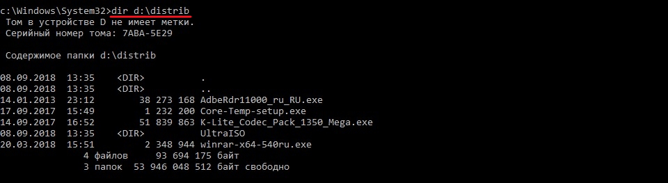 Если нужно обратиться к папке, которая находится на другом логическом диске, то потребуется добавить ключ d. К примеру, перейдем к папке Distrib, которая находится на диске D