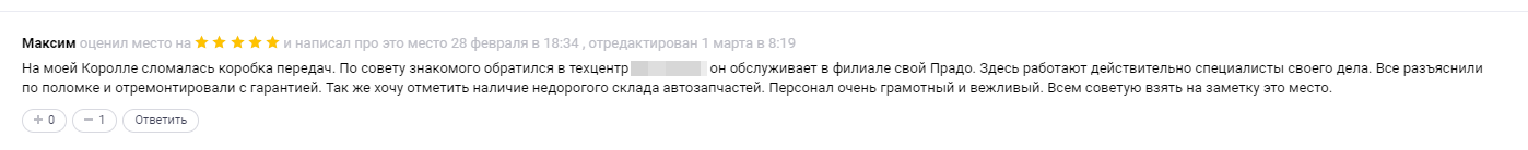 «Здравствуйте! Спасибо за ваш отзыв. Мы уверены в качестве нашей работы, а поэтому без проблем даем гарантию: на ремонтные работы – 90 дней, на покраску или тонировку – полгода. Если захотите отремонтировать что-то по мелочи – мы тоже можем помочь. Так что приезжайте, будем вам рады».