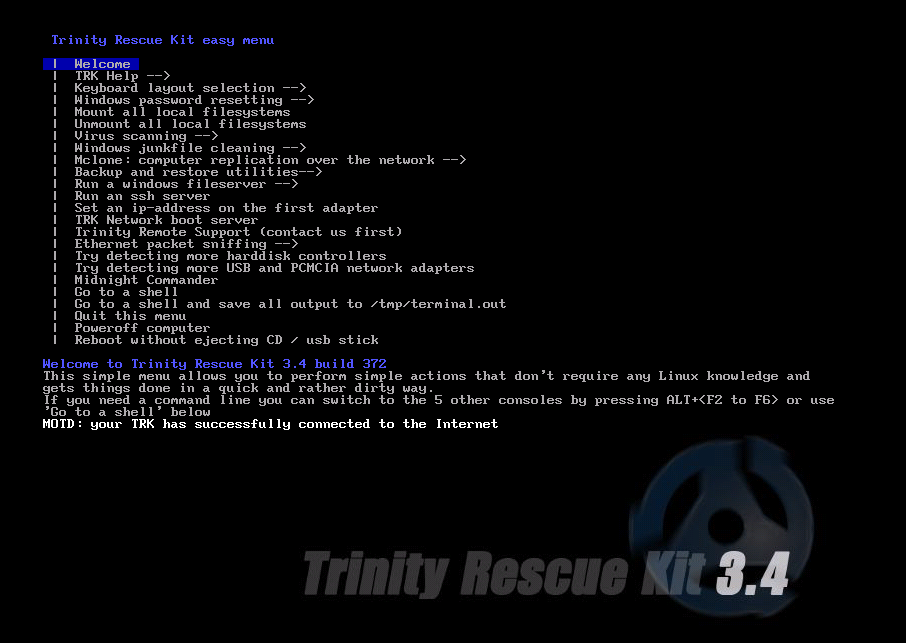 Once you get to the Trinity Rescue Kit ‘easy menu’, simply navigate through the list to choose which tool to execute. You can also switch to the command line if you want more flexibility and feel comfortable with Linux-based commands.