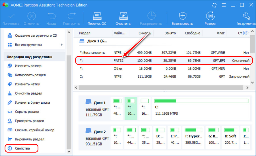 Как узнать этот идентификатор? Его должны показывать менеджеры дискового пространства, это базовый функционал, он обычно доступен в базовых бесплатных редакциях таких программ. Например, в AOMEI Partition Assistant идентификатор раздела узнаётся в его свойствах.
