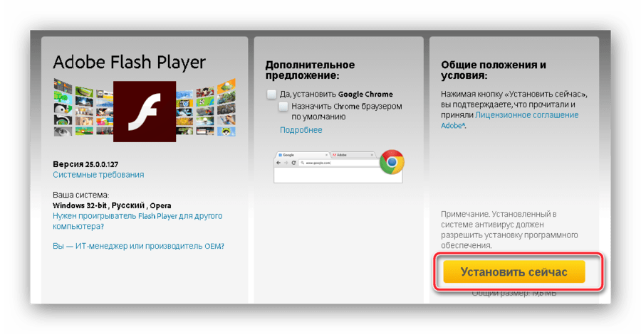 В Chrome уже установлена свежая версия плеера, так что обновление обрабатывается на 100%. Вам не нужно ничего скачивать и устанавливать, поскольку все происходит в автоматическом режиме.