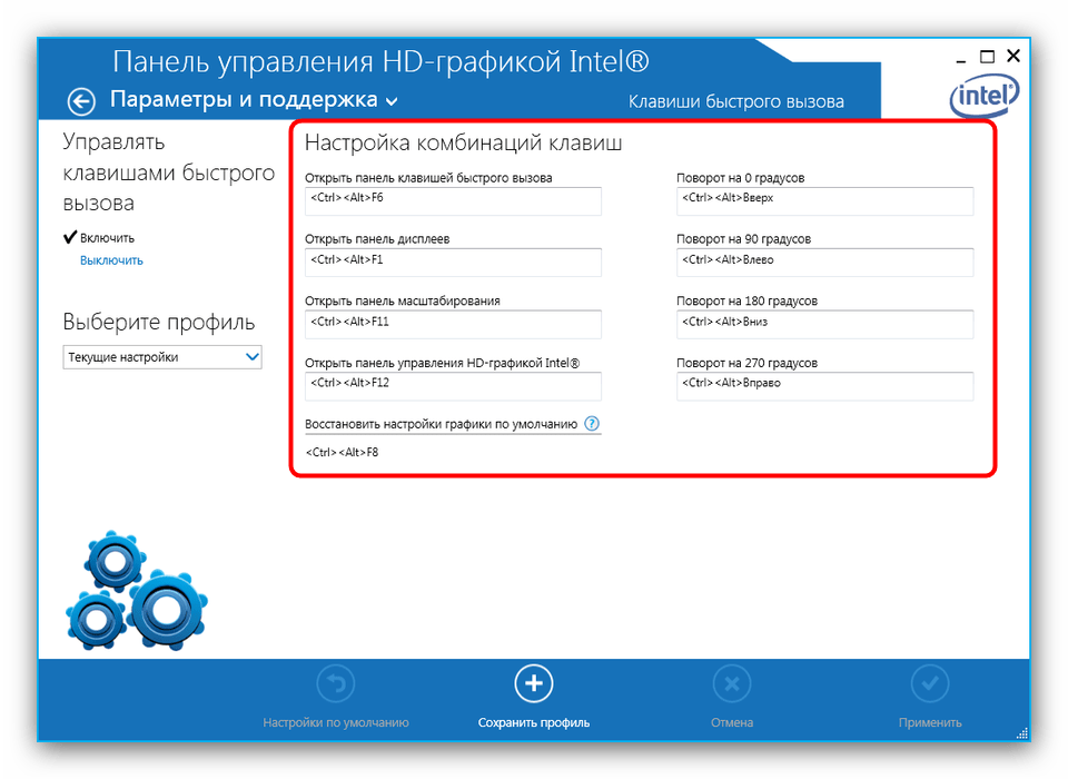 Перейдите на «Рабочий стол» и щёлкните правой кнопкой мыши по свободному пространству. Далее выберите пункт «Параметры графики», затем — «Комбинации клавиш», в которых нажмите на вариант «Выключить».