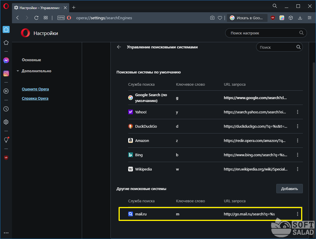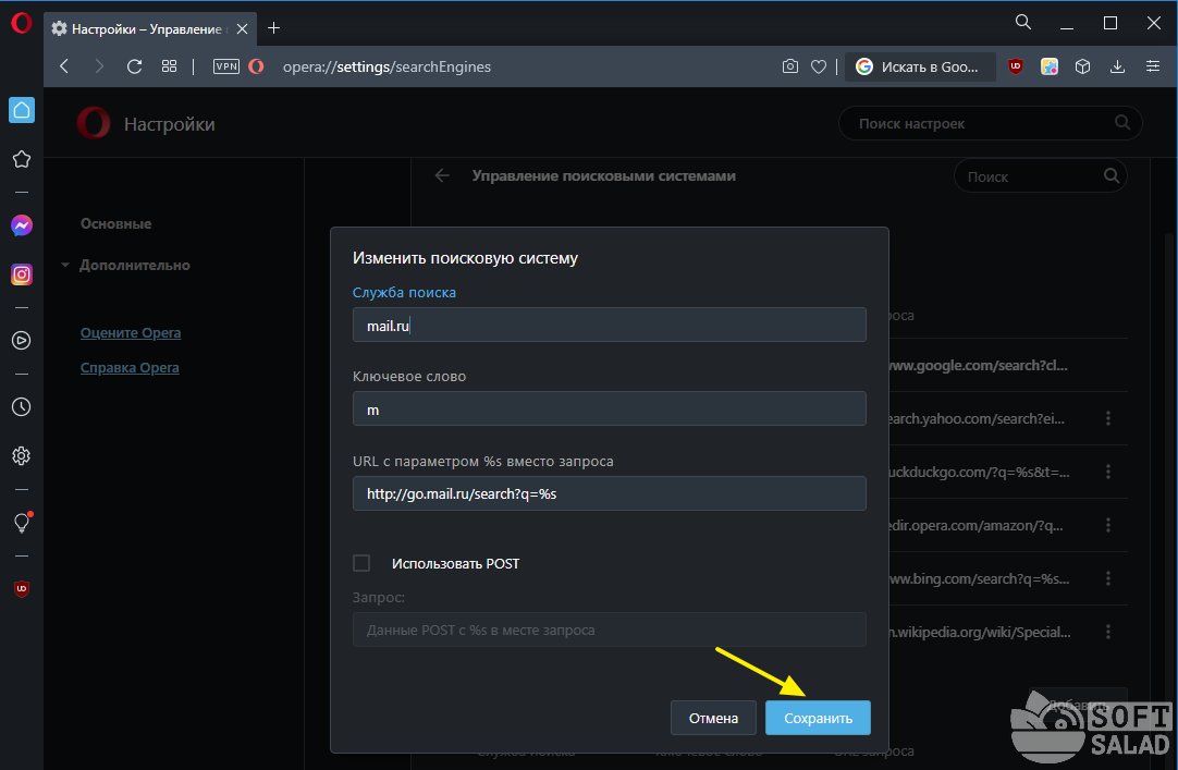 СМЕНА ПОИСКОВОЙ МАШИНЫ В АДРЕСНОЙ СТРОКЕ OPERA