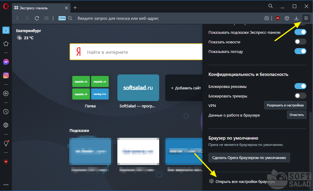 Многие пользователи сталкиваются с тем, что вся главная страница веб-браузера забита различным контентом от данного поисковика. К счастью, его можно скрыть. Чтобы убрать Яндекс из Оперы, выполните следующие действия: