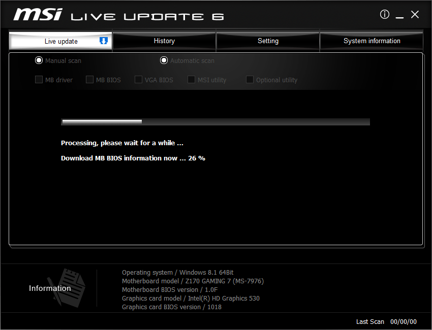 После запуска программы, перейдите на вкладку Live Update, отметьте действие Manual Scan (ручное сканирование), затем MB BIOS (БИОС материнской платы) и нажмите Scan.