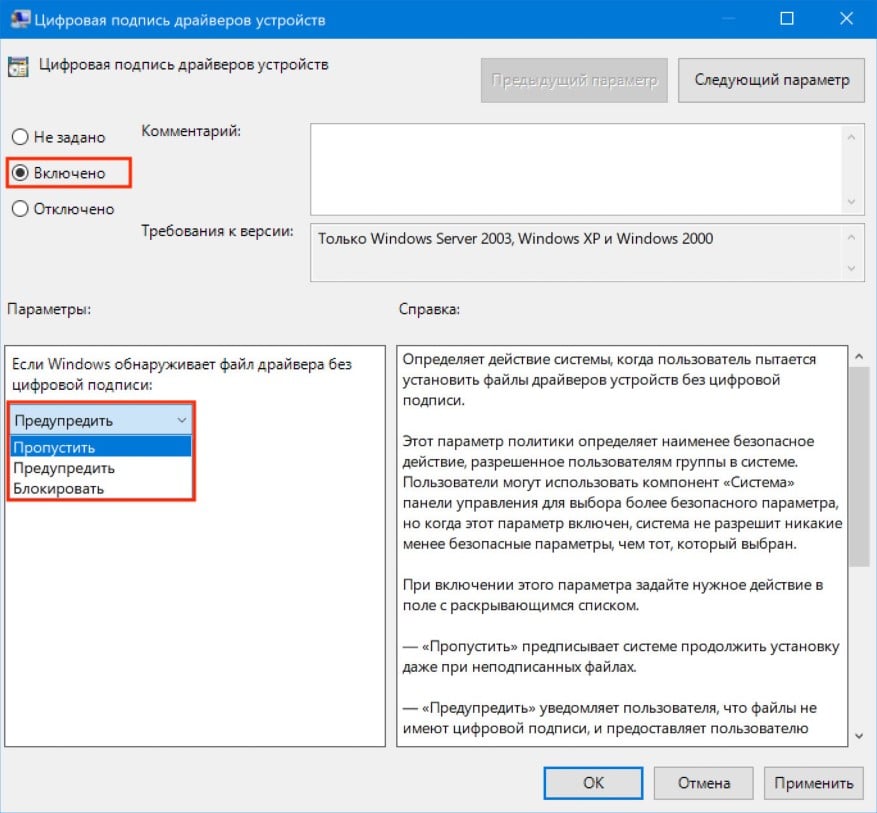 3. Перевести параметр в «Включено», если в низу в окне (Если Windows обнаруживает файл драйвера без цифровой подписи:) будет доступно изменения, выставить параметра «Пропустить»