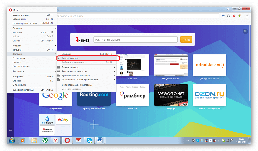 Существуют случаи, когда на главной странице браузера Опера отсутствует изначально панель закладок. Для этого нужно войти в главное меню в раздел «Закладки» и в появившемся окне поставить галочку «Панель закладок».