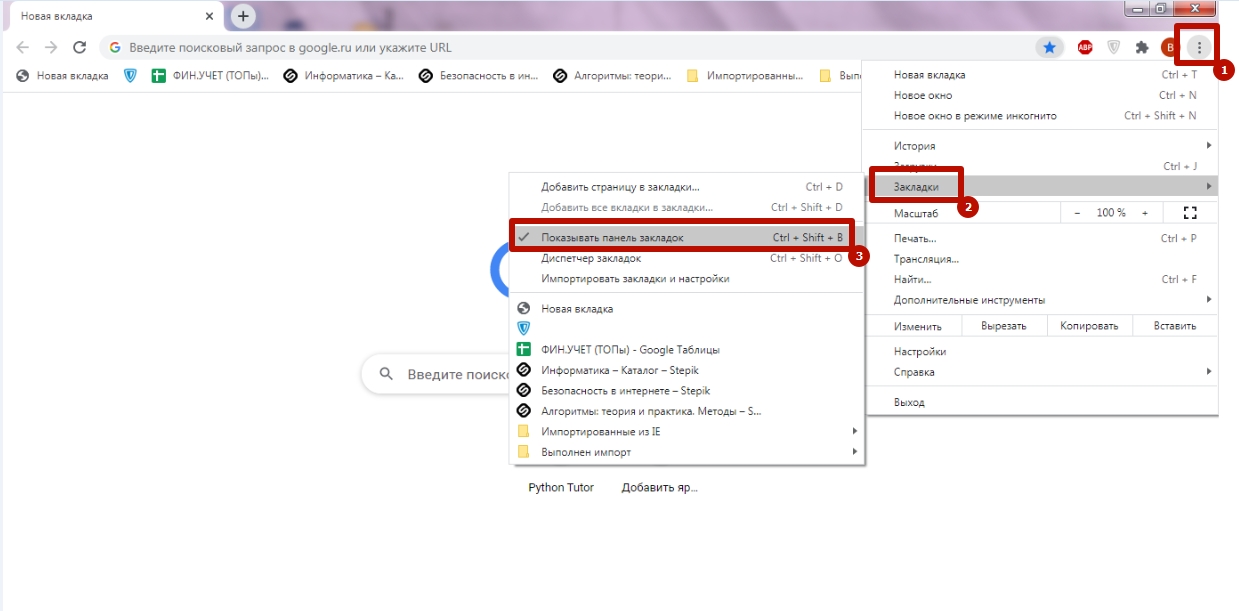 Для прямого доступа к странице лучше закрепить ее на панели, расположенной ниже адресной строки. Предварительно необходимо убедиться, что она включена. Если панель отсутствует, нужно включить отображение вручную при помощи комбинации CTRL+SHIFT+B или через раздел «Закладки» меню Chrome.