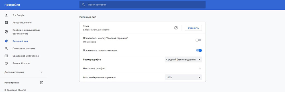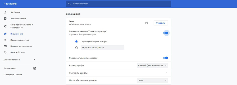 В разделе «Внешний вид» необходимо отключить переключатели рядом с пунктами «Показывать кнопку Главная страница» и «Показывать панель закладок».