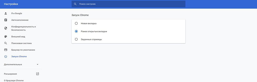 Чтобы выбрать нужный вариант, в разделе «При запуске» (в меню слева) необходимо выбрать желаемый вариант из доступного списка.