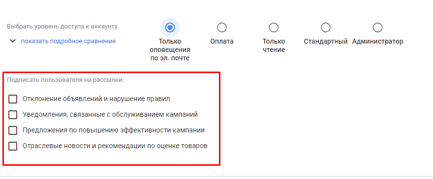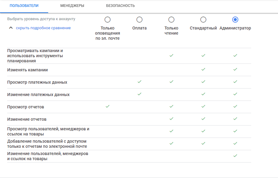 Начнем с того, какие есть уровни доступа в Google Ads.