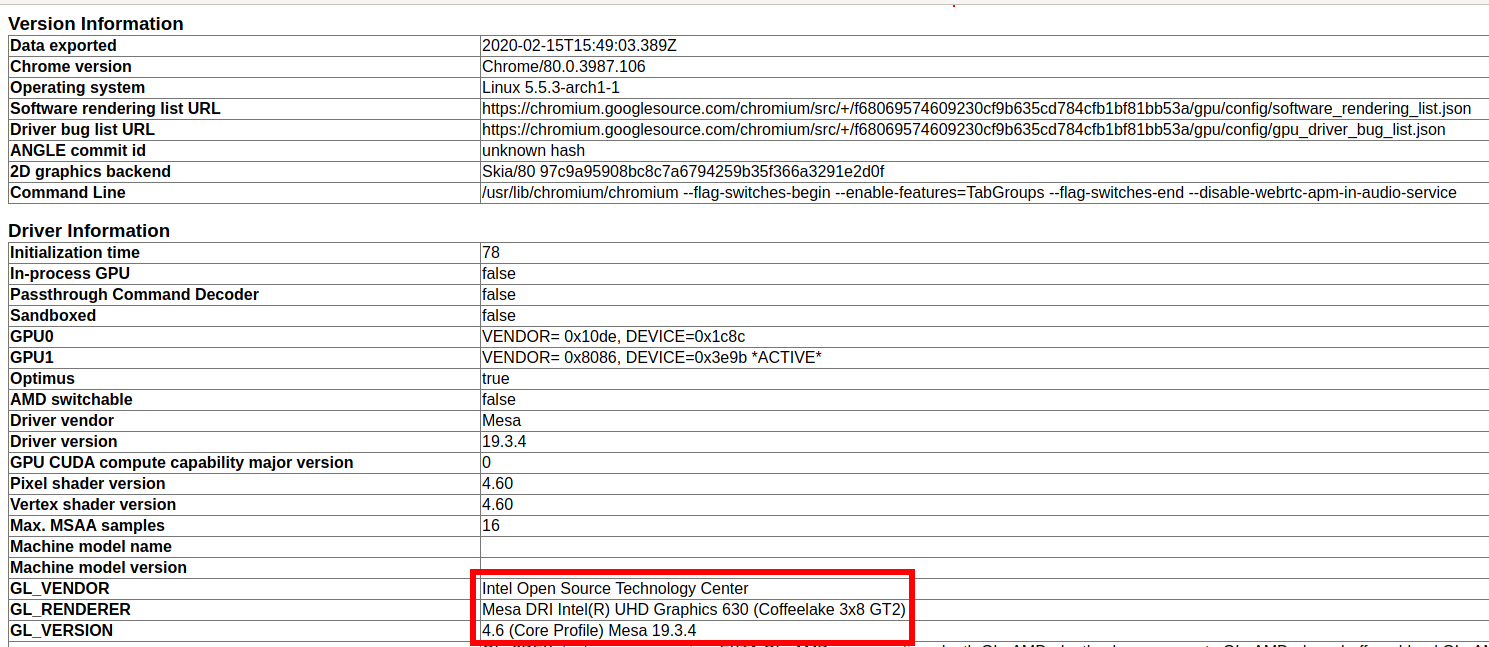 OpenGL vendor string: Intel Open Source Technology Center OpenGL renderer string: Mesa DRI Intel(R) UHD Graphics 630 (Coffeelake 3x8 GT2)