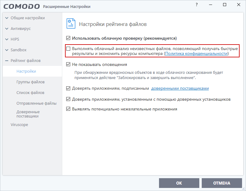 Ещё есть раздел Рейтинг файлов. Неизвестные антивирусу программы и файлы могут проверяться на серверах Comodo. По умолчанию функция отключена: