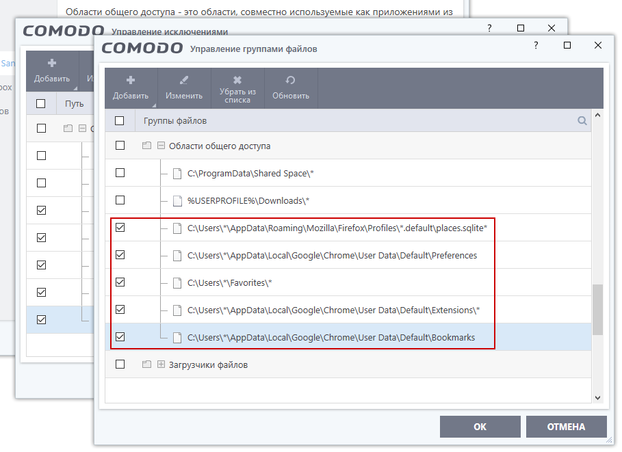 В принципе, здесь настраивать нечего, за исключением, пожалуй, того момента, что по умолчанию папки браузеров со всеми настройками доступны для изолированных программ. Это чревато кражей сохраненных в браузерах паролей и установкой «левых» дополнений к ним. Поэтому жмите на «…указанным файлам и папкам», затем правой кнопкой по «Области общего доступа» — «Изменить» — «Да» — откроется новое окно, где можно удалить искомые разрешения:
