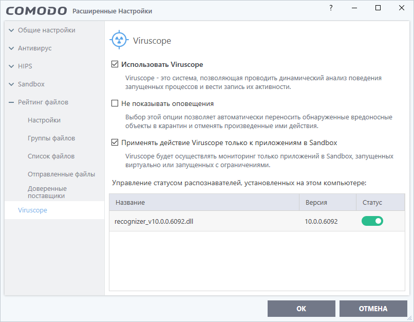 Раздел VirusScope лучше не трогать, там всё оптимально: