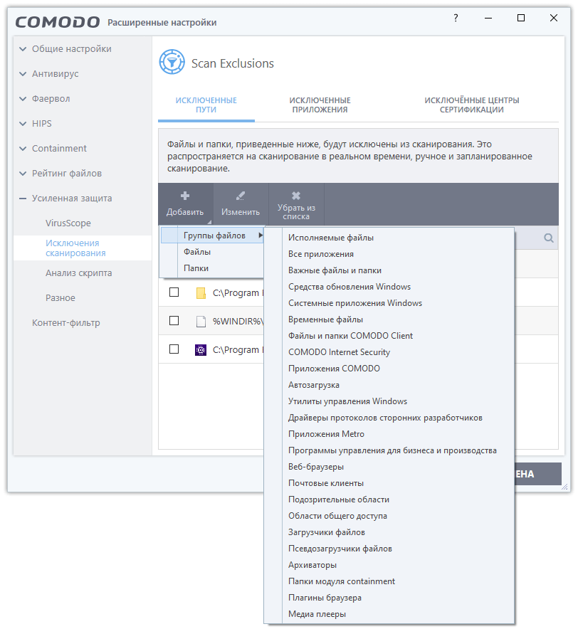 Как добавить файл или папку в исключения Comodo Internet Security Premium