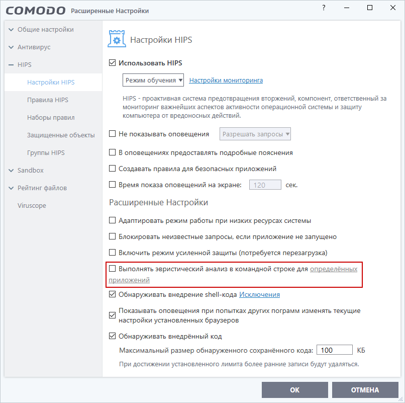 Обратите внимание, что на скриншоте выше я отметил пункт «Выполнять эвристический анализ в командной строке для определённых приложений». Снятие галки со этого пункта избавит от появляющихся окон о том, что в песочницу попала программа по адресу «C:\Program Data\Comodo\Cis\tempscript\C_cmd.exe…»