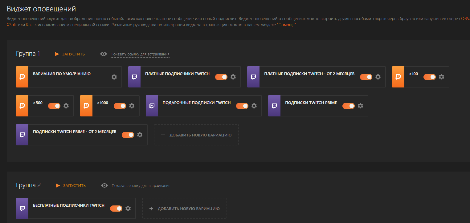 Вы увидите, что по умолчанию уже есть несколько вариантов предупреждений, которые разделены на группы 1 и 2. Первая содержит уведомления о пожертвованиях, подарочных подписках, хостах и рейдах, а вторая — о платных и бесплатных подписках. Нам нужно первое.