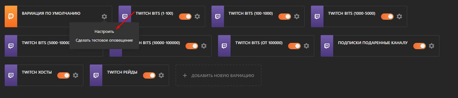 При желании можно создавать новые вариации. Это полезно, если вам нужен уникальный тип уведомления для определенной суммы пожертвования. Например, крикун при пожертвовании 666 рублей или эпический звук при получении крупной суммы. Конфигурация не имеет большого значения. Единственное, что вам нужно установить правильное условие вариации, а затем выбрать нужные изображения и аудио.