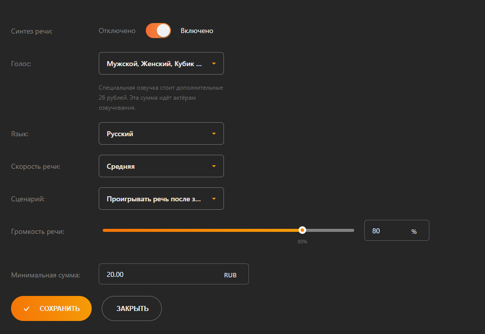 В пункте «Языки» также ставим галочки напротив всех вариантов и оставляем среднюю скорость речи. В строке «Сценарий» выберите Воспроизвести речь после звука. Это начнёт читать сообщение после того, как закончится воспроизведение выбранного вами звука. Установите «Громкость голоса» на 80%. В строке «Минимальная сумма» вы можете выбрать сумму, от которой будут оглашаться сообщения. 20 рублей для начинающего стримера — это то, что нужно. Щелкните «Сохранить”.