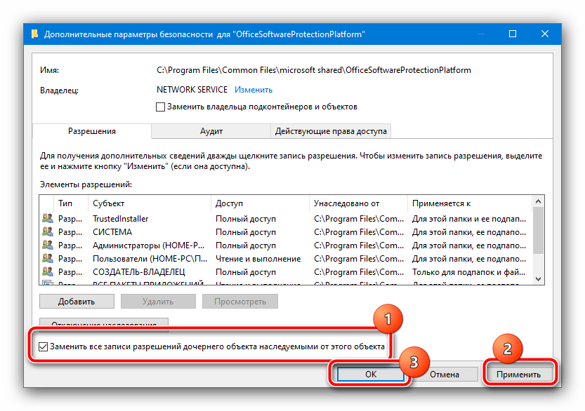 Повторите действия по выдаче разрешений пользователю NETWORK SERVICE из шага 3, они ничем не отличаются. Единственное дополнение – о.