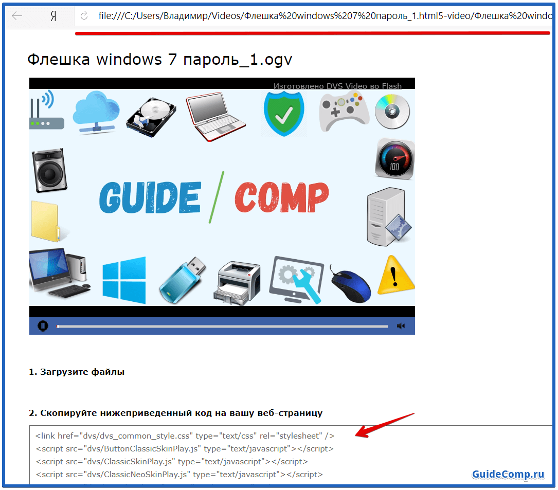 Чтобы вставить ролик на сайт, достаточно скопировать JavaScript код со страницы в браузере, которая открылась после конвертации, и вставить в блок для видео на веб-ресурсе.