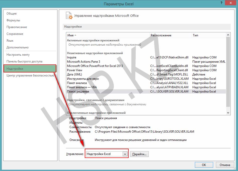 Выбираете «Надстройки» и рядом с надписью «Управление» в выпадающем меню выбираете «Надстройки COM«, жмете перейти.