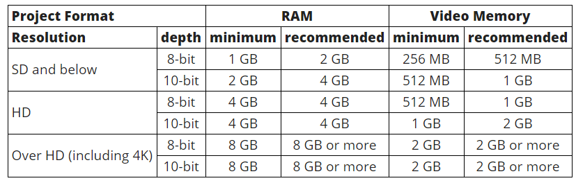 | Memory | 4 GB RAM minimum Requirements for RAM and video memory vary depending on the project format. For SD/HD projects: 4 GB or more RAM recommended. For 4K projects: 8 GB or more RAM recommended |