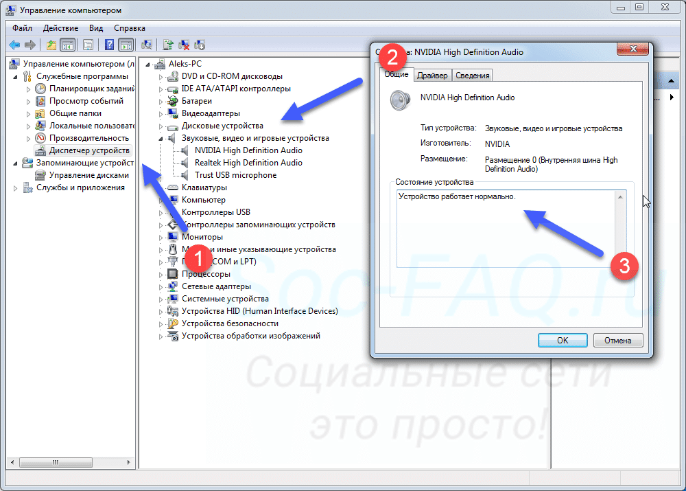 Эти действия также легко выполняются вручную. Состояние службы Windows Audio проверяется в оснастке services.msc, состояние устройства – в Диспетчере устройств и окошке «Звук» на вкладке «Воспроизведение».