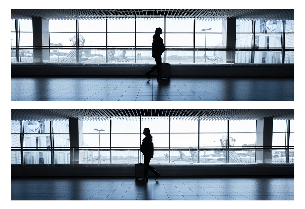 Воздух в направлении движения. Если объект движется, между направлением его движения и границей кадра должно быть свободное пространство. На примере ниже женщина идет вперед, но в кадре перед ней нет воздуха, из-за чего у зрителя появляется дискомфортное ощущение движения вслепую. На следующей картинке воздух есть, поэтому изображение воспринимается гармонично. Зритель видит не меньше героя и точно знает, что через мгновение в кадре внезапно не появится обрыв, препятствие или что-то еще.