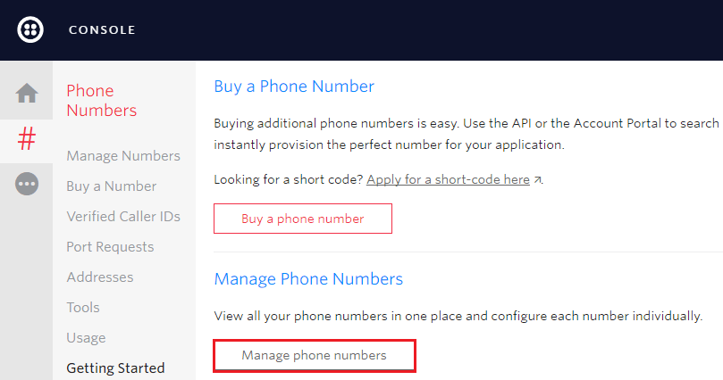 Для управления Twilio-номерами кликните кнопку «Manage phone numbers».