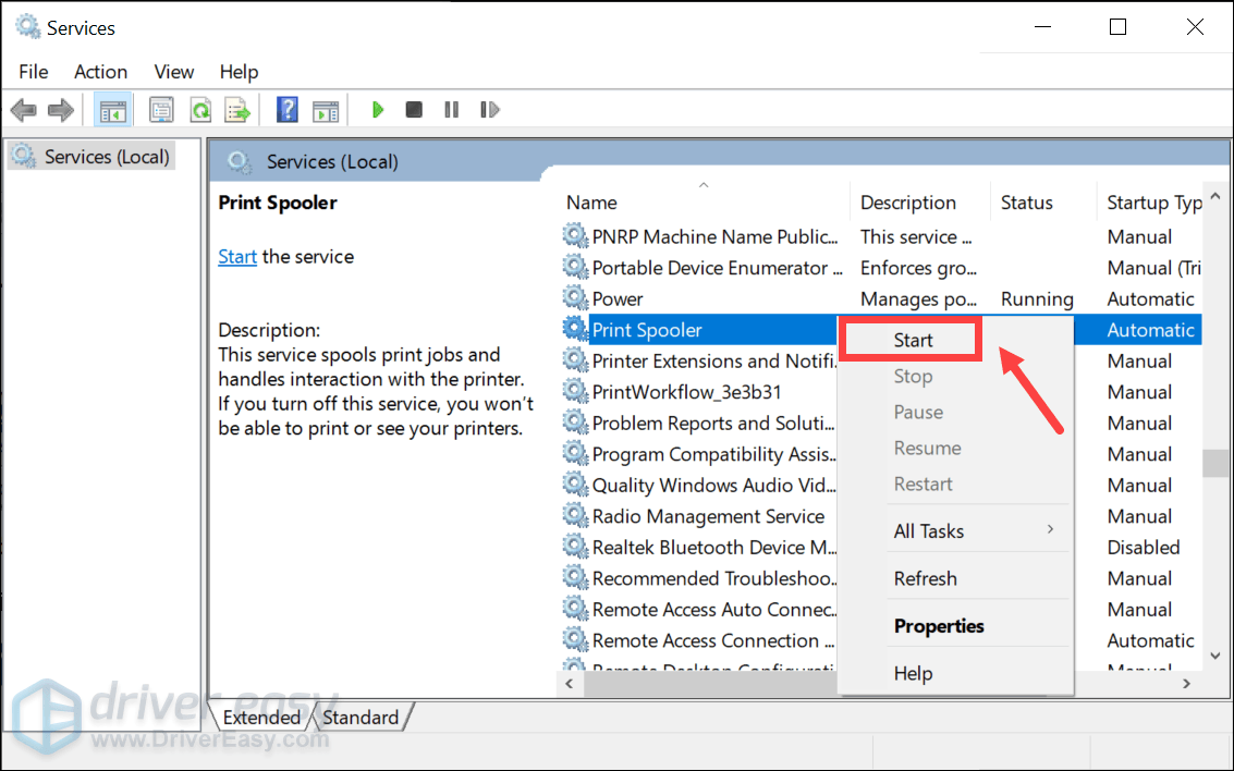 Вернитесь к Услуги окно. Щелкните правой кнопкой мыши Диспетчер очереди печати сервис и выберите Начинать .