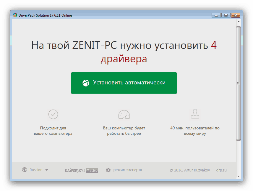 Если первым методом не получается воспользоваться, то пригодятся сторонние программы-драйверпаки, которые способны самостоятельно загружать драйвера к распознанному оборудованию. Мы рекомендуем использовать DriverPack Solution, поскольку данное приложение самое дружелюбное к пользователю.