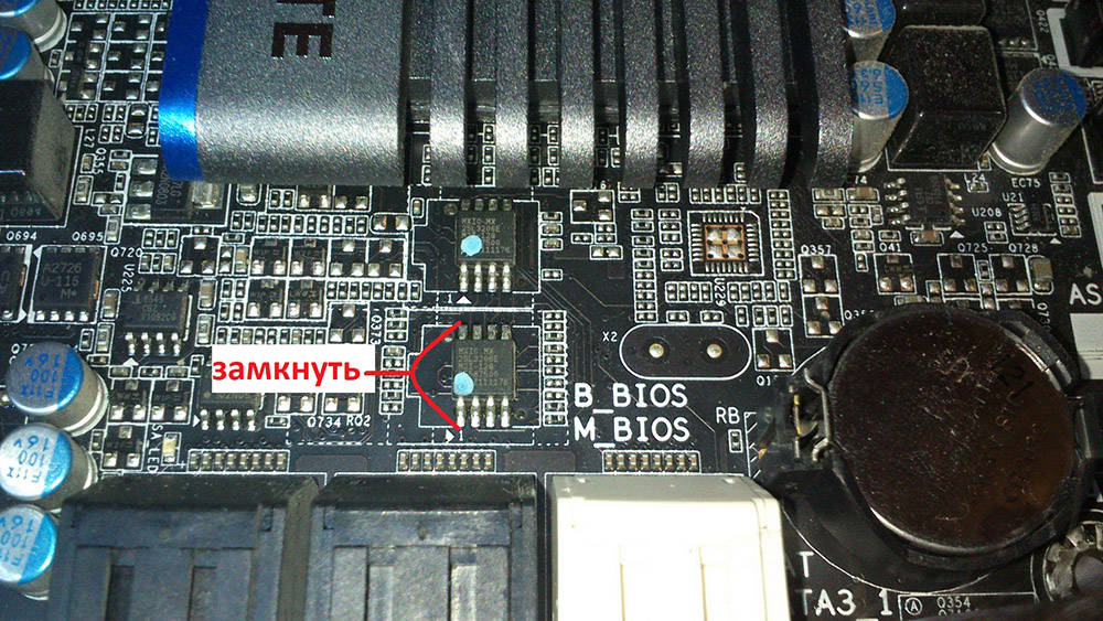 Рядом с большой круглой и плоской батареей, питающей микросхему, где BIOS хранит свои настройки, и называемой CMOS, есть небольшой двух- или трёхпиновый разъём. Если у него 2 контакта, то перемычки на нём нет, и контакты нужно просто замкнуть на несколько секунд, например, отвёрткой.