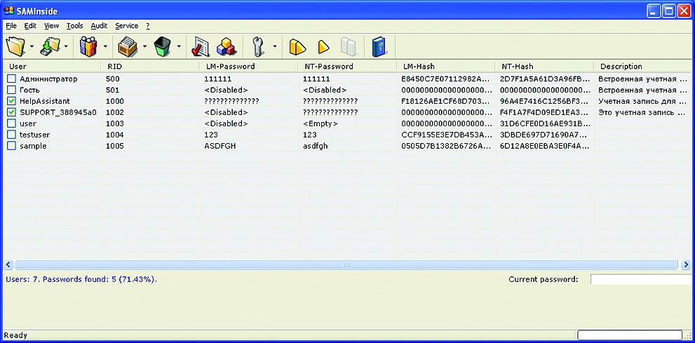 insidepro.com/rus/saminside.shtml Пожалуй, самая популярная программа для взлома NTLM-хешей. Позволяет импортировать свыше десяти типов данных и использовать шесть видов атак для восстановления паролей пользователей.Код брутфорсера полностью написан на асме, что обеспечивает очень высокую скорость перебора