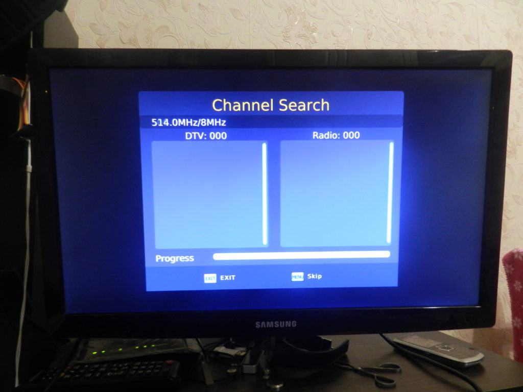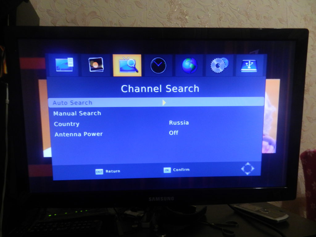 Поскольку приставка принимает цифровое ТВ, то ко всему прочему мы получаем ещё массу плюшек. Но для начала нам надо найти каналы, делается это элементарно. Жмем на пульте «menu» и кнопками громкости выбираем соответствующий пункт меню(см. фото):