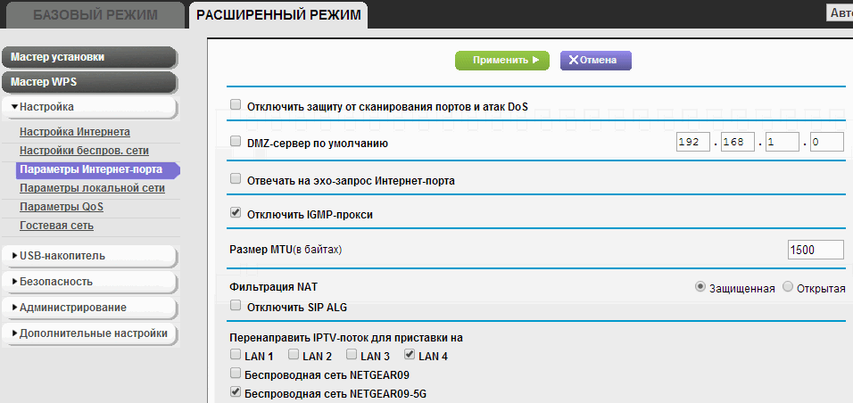 Выбираем интерфейс подключения IPTV-приставки и кликаем «Расширенный режим».