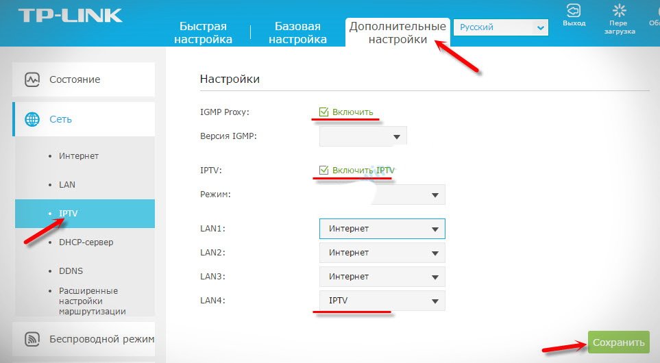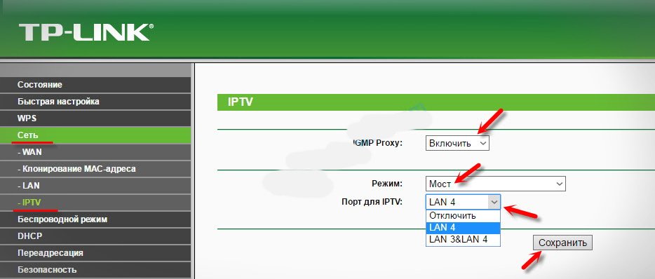 - Зайдите в подпункт «Перенаправить IPTV» и отметьте — LAN 4.