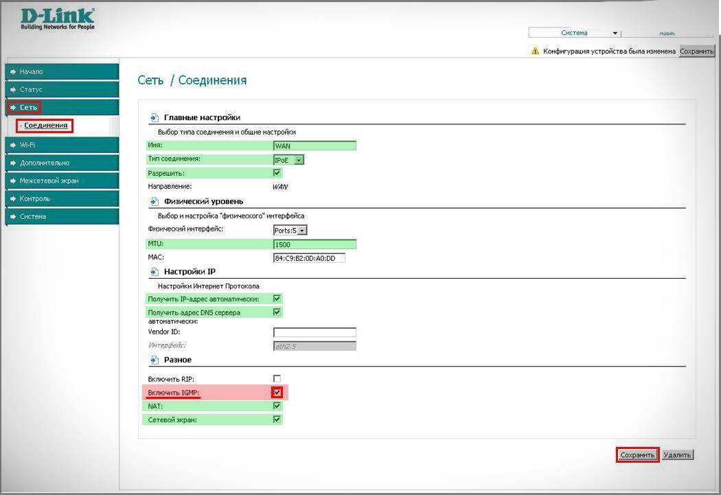 - Функция IGMP Proxy на роутерах D-Link дарит возможность смотреть IPTV на ПК и телевизорах, которые подключаются в домашнюю сеть. Если она деактивирована, в «Настройках соединения» переходим во в кладку «WAN» и активируем данную опцию для используемого интерфейса.