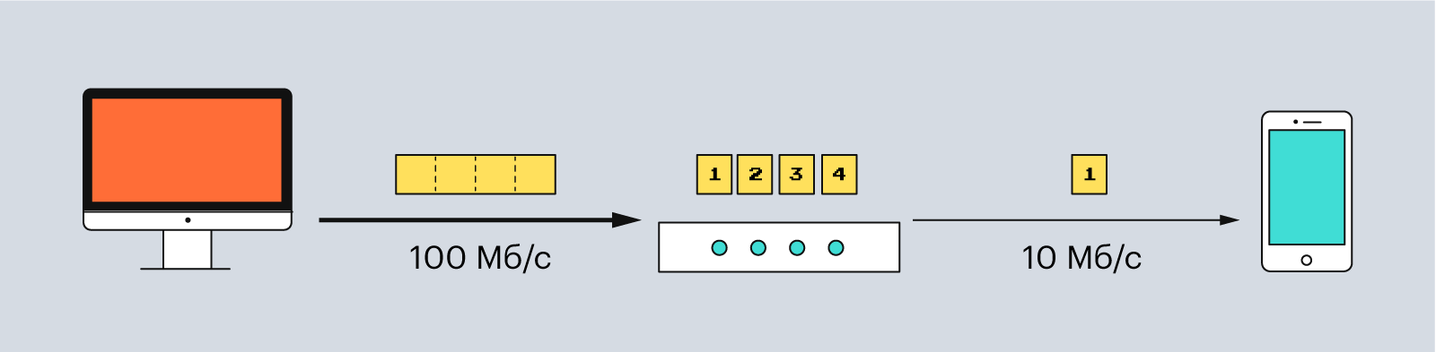 Вот так данные разделяются на несколько сегментов, чтобы протиснуться в сеть с пропускной способностью 10 Мб/сИзображение: Skillbox Media