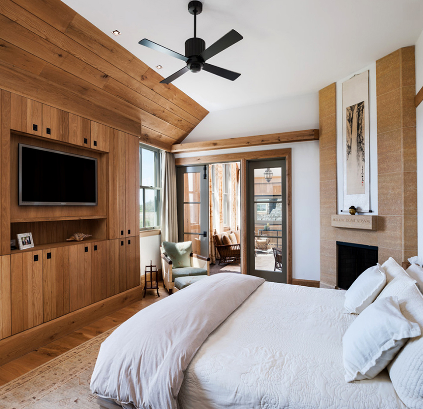 В спальне телевизор можно прикрепить к потолку. При этом он необязательно должен быть установлен вблизи стены, противоположной изголовью кровати. Прибор может располагаться непосредственно над спальным местом