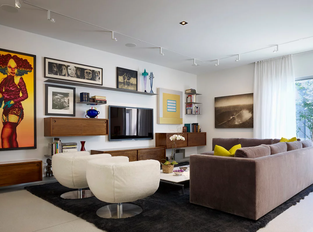 - Гостиная. В этой комнате обычно располагается зона отдыха для всей семьи с мягкой мебелью. Телевизор лучше всего повесить к стене напротив этой зоны на высоте, соответствующей высоте посадки человека в кресле или на диване. Обычно она равна 120 см с небольшими отклонениями в ту или иную сторону.