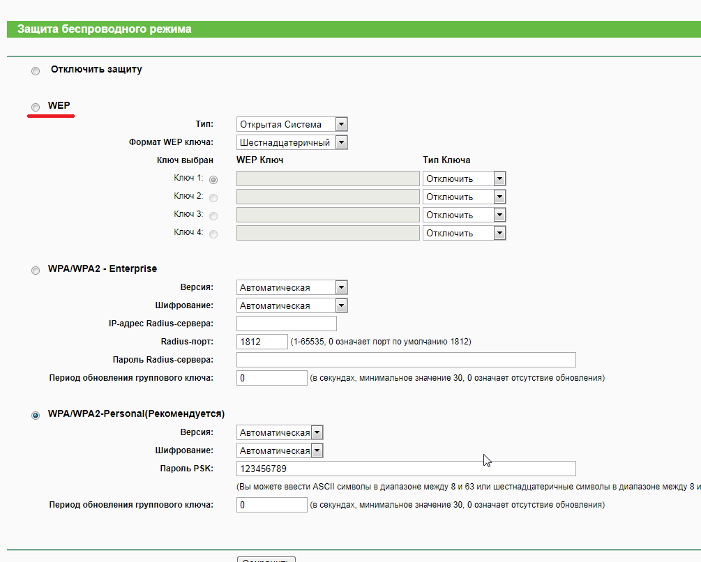 - Поэтому вместо этих 2-х значений попробуйте выбрать защиту WEP, расположенную наверху, а от этих 2-х отключитесь.