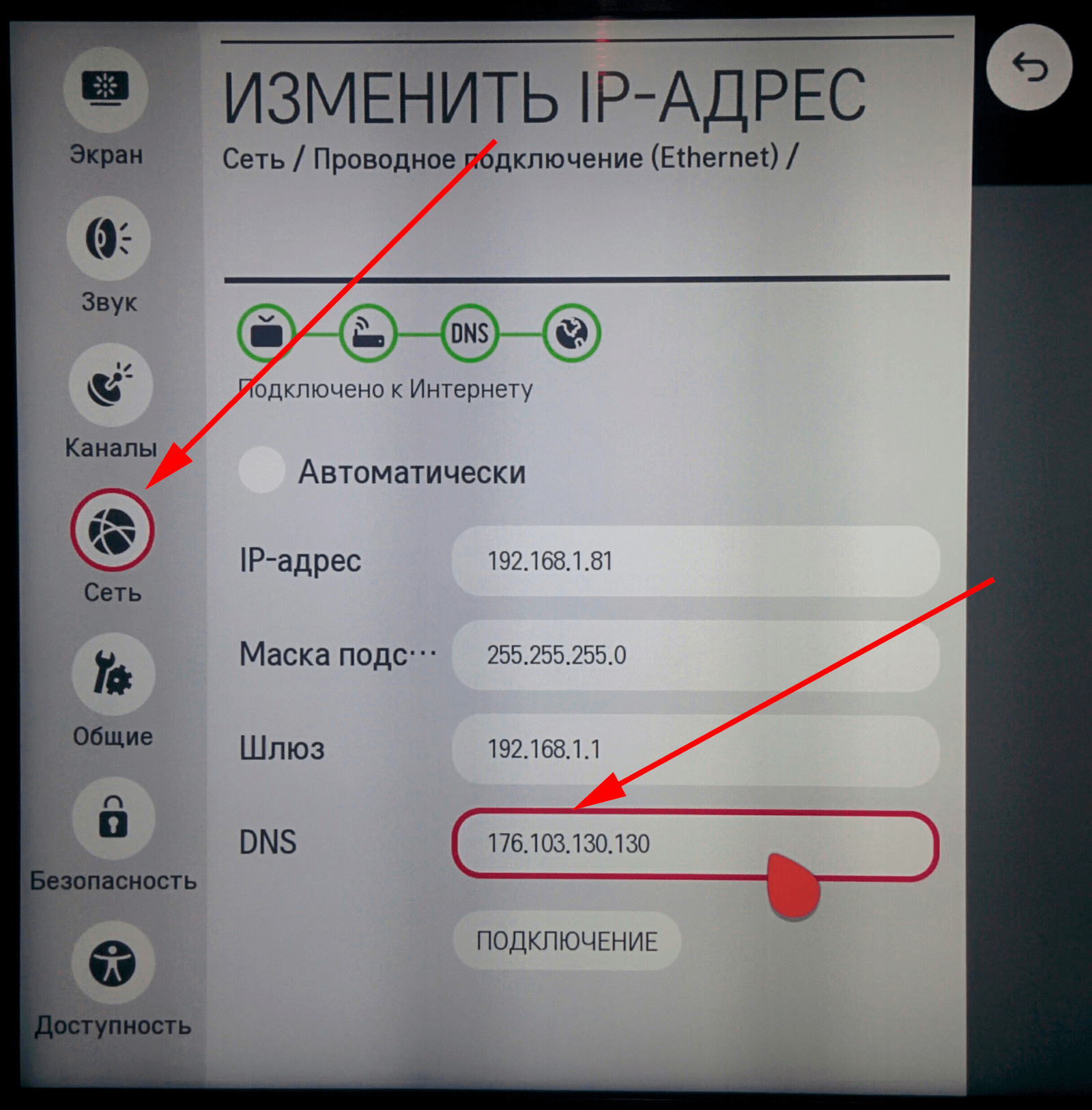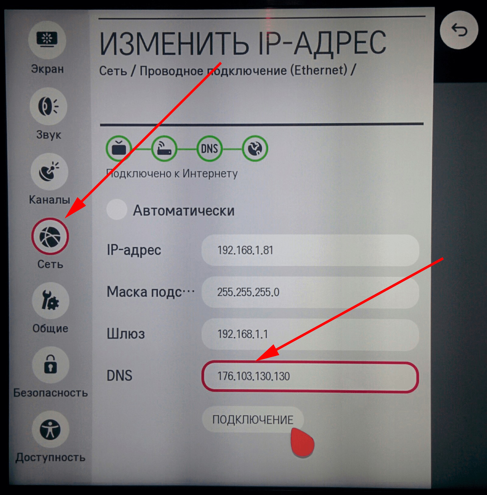 DNS называют такую техническую систему, которая дает вход во все программы. В данном случае на все веб-сайты. Благодаря ей работают все телеканалы и вы спокойно можете переключаться между приложениями на ТВ. Если телевизор не видит вай фай — можно попробовать изменить DNS. Для этого вам необходимо: