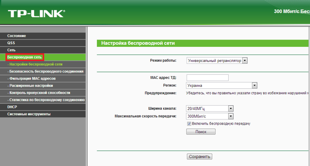 - Зайдите в окно конфигурации роутера, выберите раздел «Беспроводной режим».