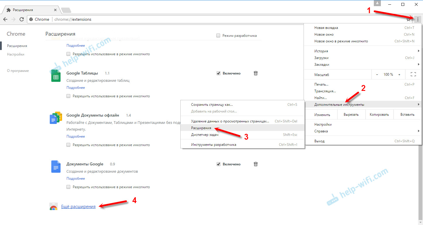 Откройте меню, перейдите в «Дополнительные инструменты» и выберите «Расширения». Затем, снизу нажмите на «Ещё расширения».