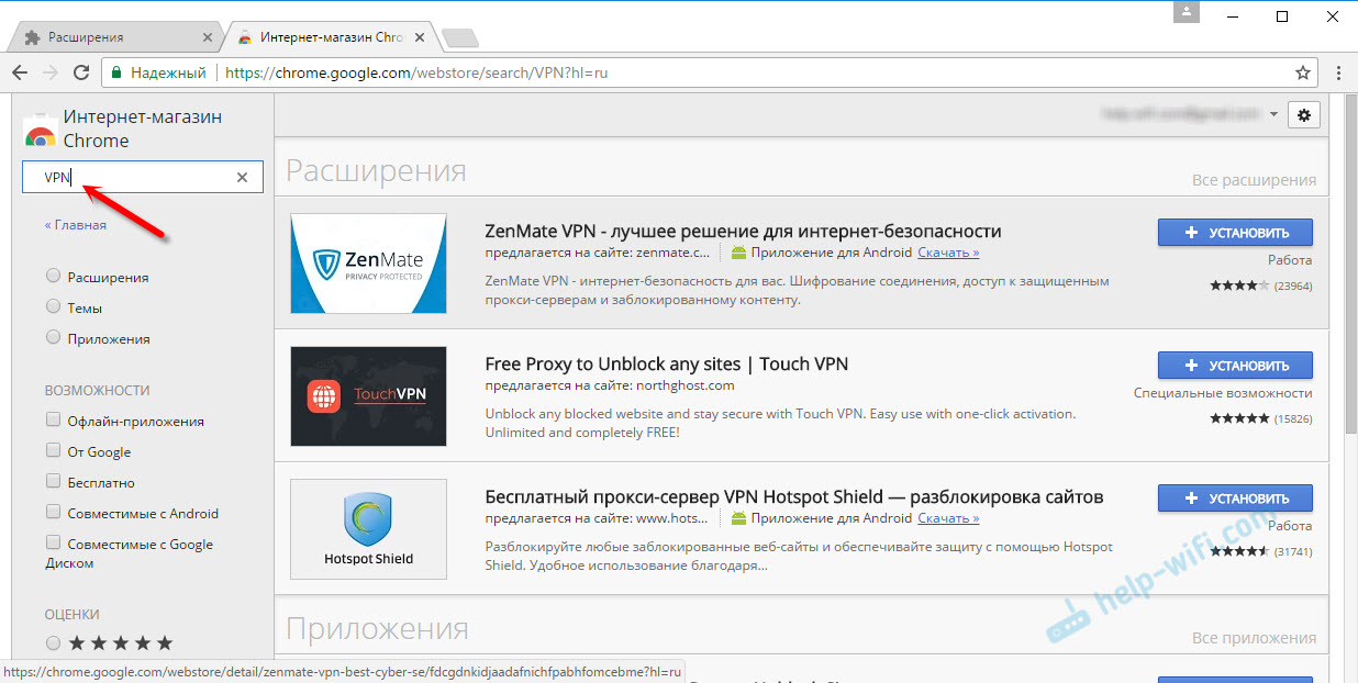 Откроется новая вкладка с магазином разных дополнений для браузера Chrome. Можно просто в поиске задать VPN, и мы получим список необходимых расширений.