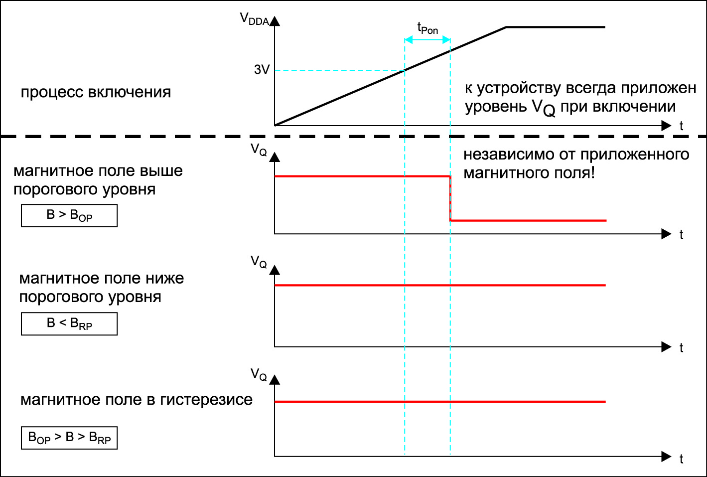 Благодаря усовершенствованным характеристикам включения, перезагрузки и выключения, а также наличию полного спектра функций защиты применение коммутаторов Холла улучшает качество системы и ее безопасность, расширяет возможности мониторинга. Интегральные коммутаторы Холла обеспечивают заданный, фиксированный выходной сигнал в процессе запуска. Это предотвращает передачу некорректной информации на микроконтроллер и его неверное истолкование (рис. 4). Таким образом, упрощается контроль системы пользователем и повышается ее производительность. Кроме того, благодаря заданной процедуре запуска достигается и определенное поведение при отключении, что позволяет предотвратить неконтролируемый емкостной разряд выходов схемы. Эта особенность также может быть использована во время включения для проверки функционирования датчика.